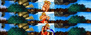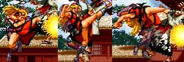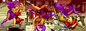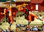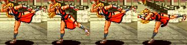 連続して攻撃しながら前進する真超力。最後のサマーソルトキックが当たると相手を空中で捕まえて投げを仕掛けて、最後に挑発して終わり。